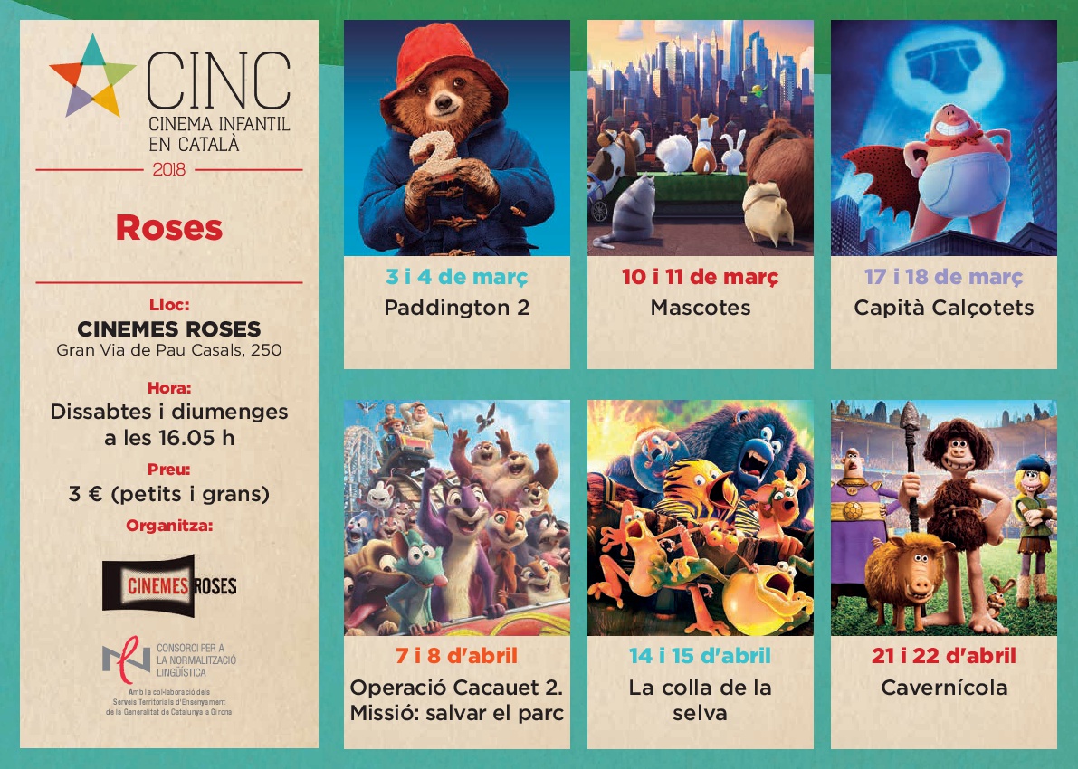 Entre el 3 de març i el 22 d’abril, es projectaran sis pel·lícules als Cinemes Roses: Paddington 2 (3 i 4 de març), Mascotes (10 i 11 de març), Capità Calçotets (17 i 18 de març), Operació Cacauet 2. Missió: salvar el parc (7 i 8 d’abril), La colla de la selva (14 i 15 d’abril), Cavernícola (21 i 22 d’abril).
