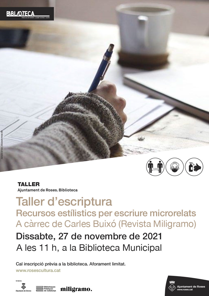 T’agrada escriure? En aquest taller intensiu coneixerem les principals tècniques narratives. Les analitzarem en els textos dels altres i les aplicarem als propis. Llegirem i agafarem pols escrivint i posant en comú la nostra feina amb els companys. Buscarem les paraules encertades, crearem personatges i elaborarem conflictes. Comen- çarem a posar les bases del nostre projecte de novel·la o de recull de contes.