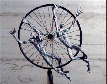 Bronze, fusta i ferro com a representació simbòlica de l’home que, atrapat en el cercle viciós de la vida, s’arrapa a muntanyes d’esquerdades certeses per encarar el repte quotidià de no deixar-se engolir per les circumstàncies.