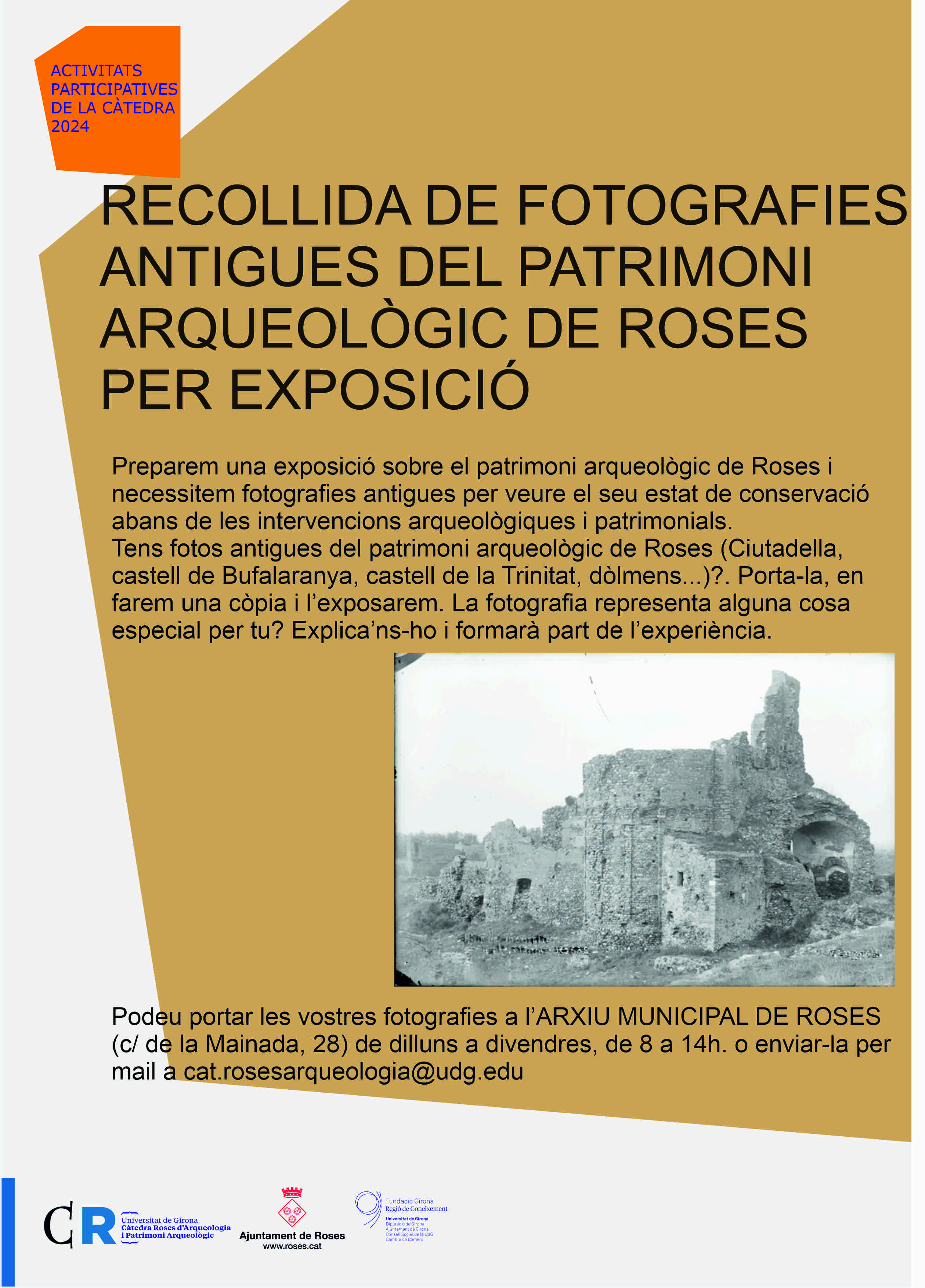 Podeu portar les vostres fotografies a: l’ARXIU MUNICIPAL DE ROSES (c/ de la Mainada, 28) de dilluns a divendres, de 8 a 14h.), o enviar-la per mail a: cat.rosesarqueologia@udg.edu