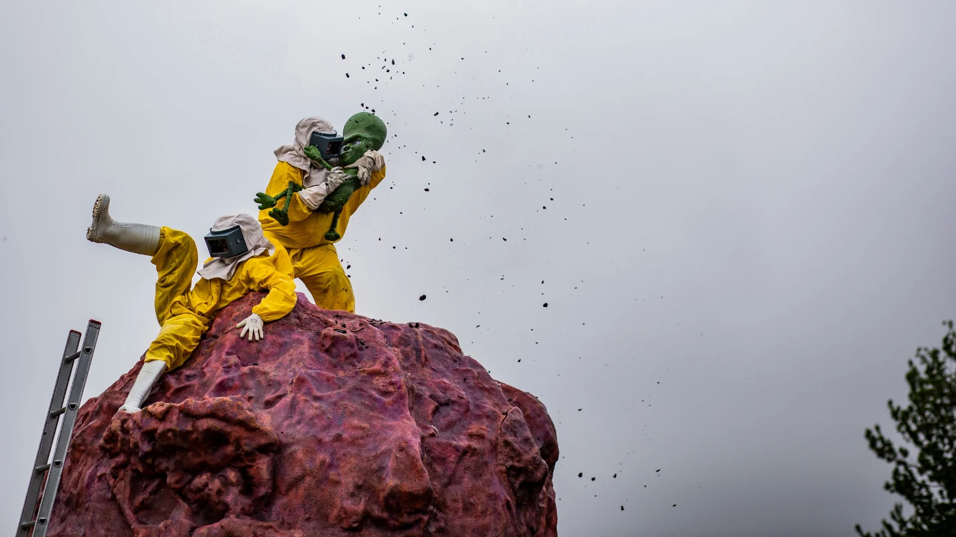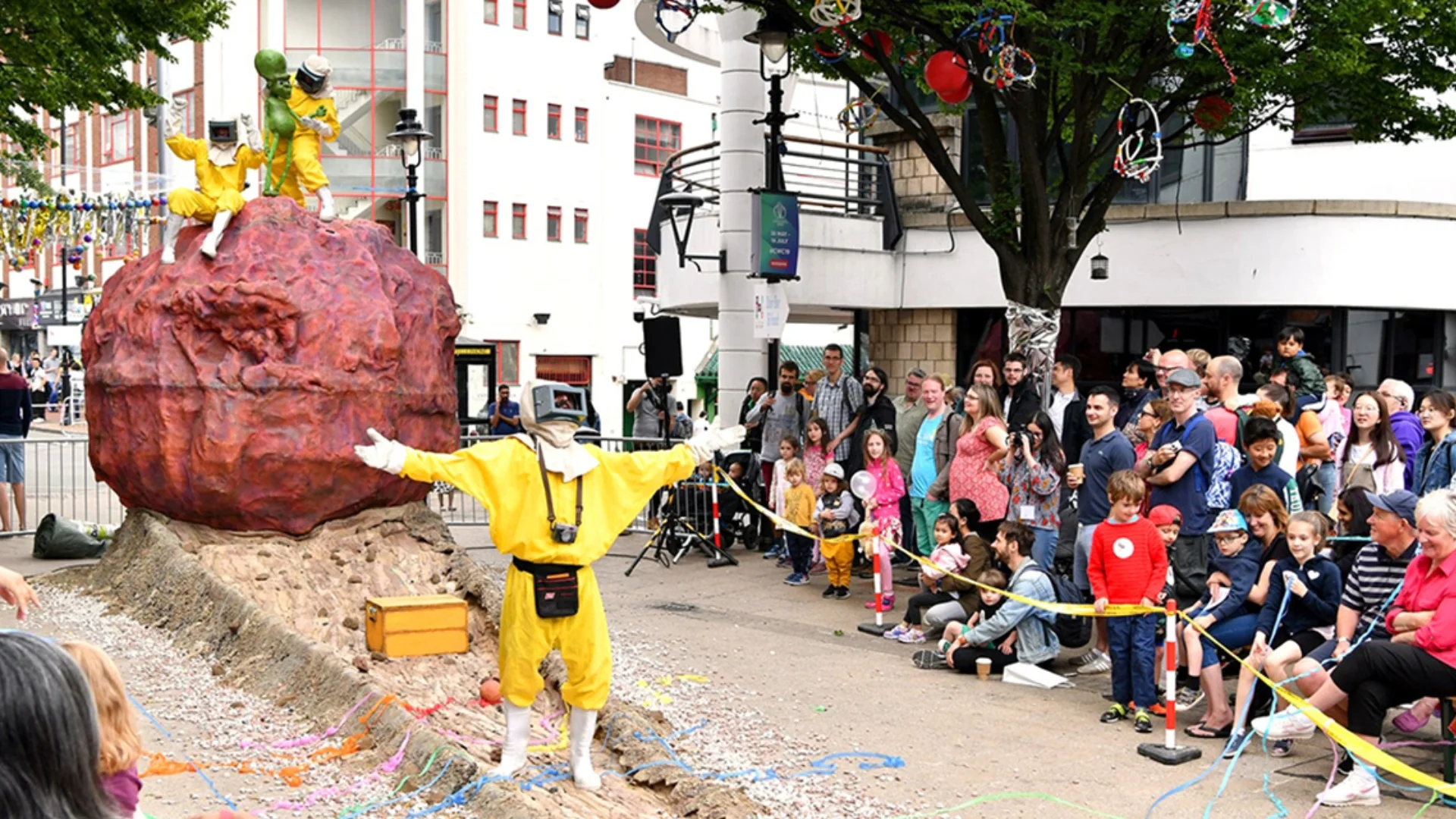 Un meteorit ha impactat a la via pública. L’equip especialista SpaceGuard fa un primer apropament. Però comencen a succeir coses inesperades. Un espectacle que, mitjançant l’humor absurd, afronta la forma de relacionar-nos amb allò que desconeixem. La producció combina teatre gestual i titelles amb l’objectiu d’aconseguir un impacte sorprenent i transformador a l’espai públic.